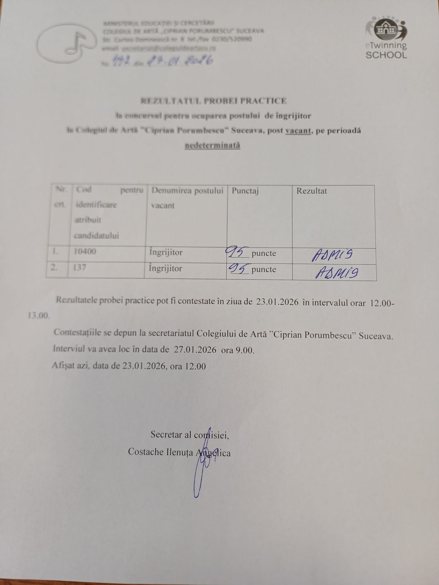 Rezultatul probei scrise la concursul postului de ingrijitor